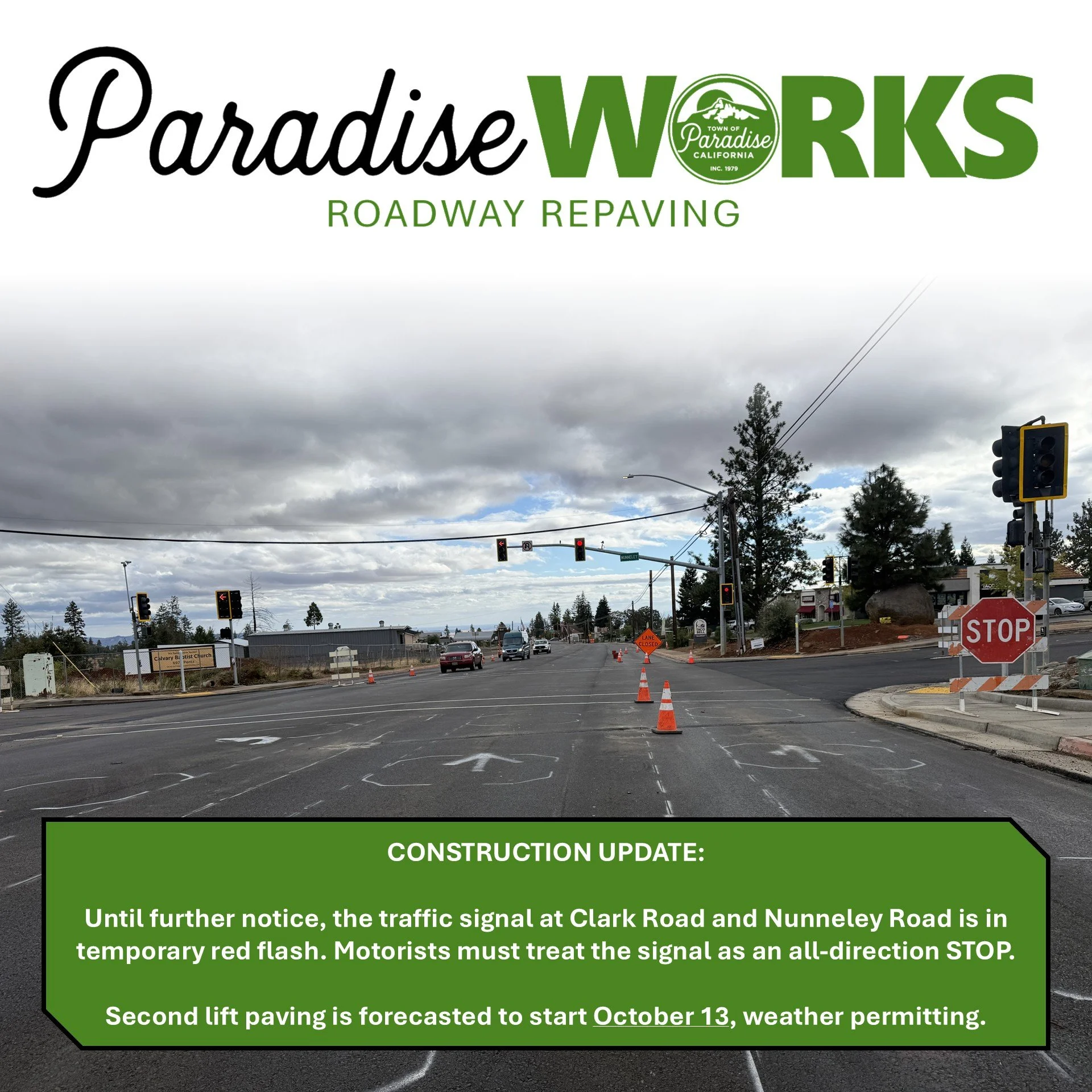 CLARK RD. - Until further notice, the traffic signal at Clark Road and Nunneley Road is flashing red. Motorists must treat the intersection as a four-way stop. Knife River Construction is planning to begin the second lift of paving the week of Oct. 13, weather dependent.